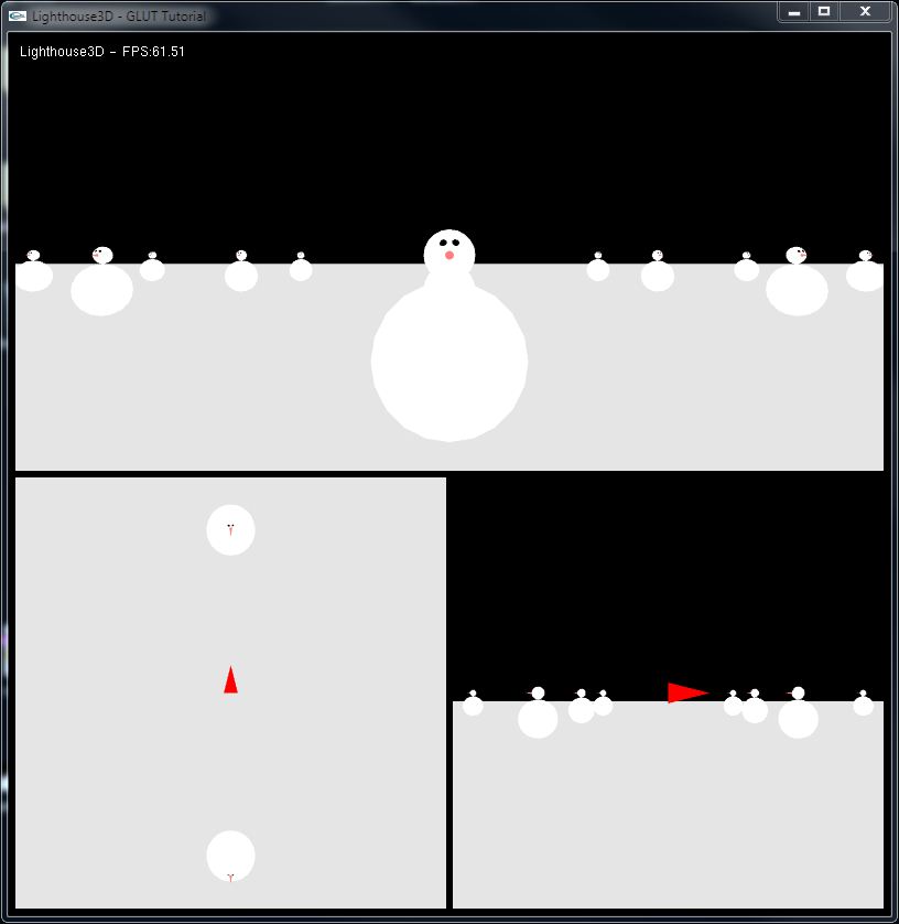 The above code creates three subwindows. Each subwindow is used to represent a different viewpoint of the same scene. The top subwindow represents the free moving camera, the bottom left the view from the top, and the bottom right the view from the right.